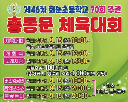 화순초총동문체육대회는 15일 오전 10시 지역 주민과 동문 가족 모두가 즐길 수 있는 명랑운동회(단체줄넘기, 줄다리기, 장애물달리기 등)를 시작으로 오후 1시 30분 개막식과 노래자랑이 진행되고, 오후 7시부터는 무대를 꽃강길 음악분수대로 옮겨 버스킹공연, 음악분수쇼, 불꽃놀이 쇼를 마지막으로 행사를 마칠 예정이다.