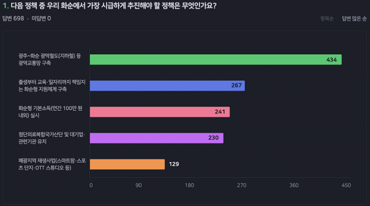 □ 임지락 도의원 측에 따르면 “이번 온라인 설문에 총 746건이 접수되었으며, 이 가운데 무효·중복 응답 48건을 제외하고 총 698건이 유효 응답으로 집계되었다”며, “698건 가운데 광주~화순 광역철도(지하철) 유치 응답이 434건으로 압도적 1위”라고 밝혔다. 이어 출생부터 교육·일자리까지 책임지는 화순형 지원체계 구축 응답은 267건, 화순형 기본소득을 응답은 241건, 첨단의료복합단지 및 대기업 관련기관 유치 응답은 230건, 폐광지역 재생사업 응답은 129건으로 나타났다. 이번 설문은 1인당 최대 2개의 정책을 선택할 수 있도록 설계되었다.