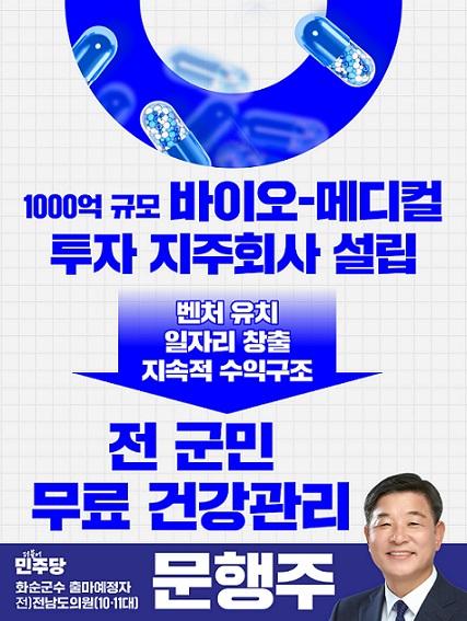 문 후보의 대표 공약 가운데 하나는 1,000억 원 규모의 바이오·메디컬 투자 지주회사 설립이다. 이 사업은 화순군과 화순전남대병원이 각각 500억 원씩을 연차적으로 투자해 공동으로 지주회사를 설립하는 방식으로 추진된다.
