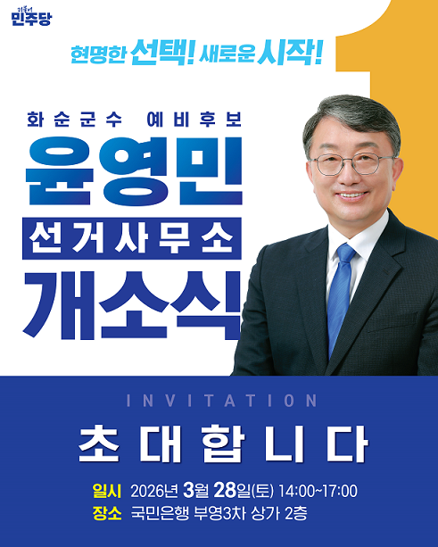 윤영민 화순군수 예비후보가 오는 3월 28일(토) 오후 2시, 전남 화순군 화순읍 광덕로 180 부영아파트 3차 상가 2층에 위치한 선거사무소에서 개소식을 열고 본격적인 선거 행보에 나선다.